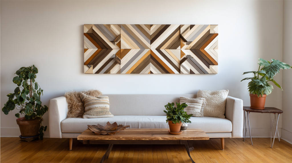 Geometric wall art using walnut, maple, and reclaimed wood pieces is very popular. Symmetry and modern patterns make these pieces timeless.